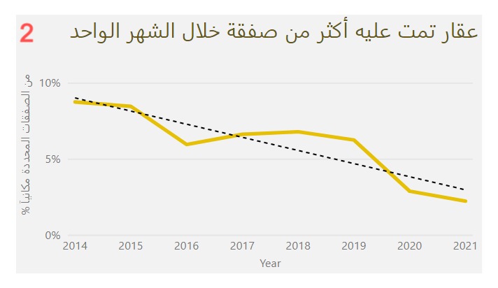 المحدِدِ لاحتساب الصفقة على العقار كمضاربة في هذا التحليل، أي عقار تمت عليه أكثر من صفقة خلال الشهر احتسبناها ضمن النسبة. كانت النسبة للفترة في المملكة حوالي 6.2% من الصفقات تكررت على نفس العقار خلال نفس الشهر (احتمالية عالية للمضاربات العقارية). في الصورة التالية يتضح الاتجاه السنوي في المملكة:
